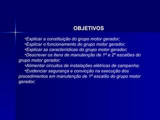 O documento descreve os objetivos e fundamentos do grupo motor gerador, que é composto por um motor a diesel que aciona um gerador alternador. O motor transforma a energia química de combustíveis em energia mecânica através da combustão, enquanto o gerador converte essa energia mecânica em energia elétrica por indução eletromagnética. O grupo motor gerador fornece energia elétrica para instalações através da transformação sequencial de energia.
