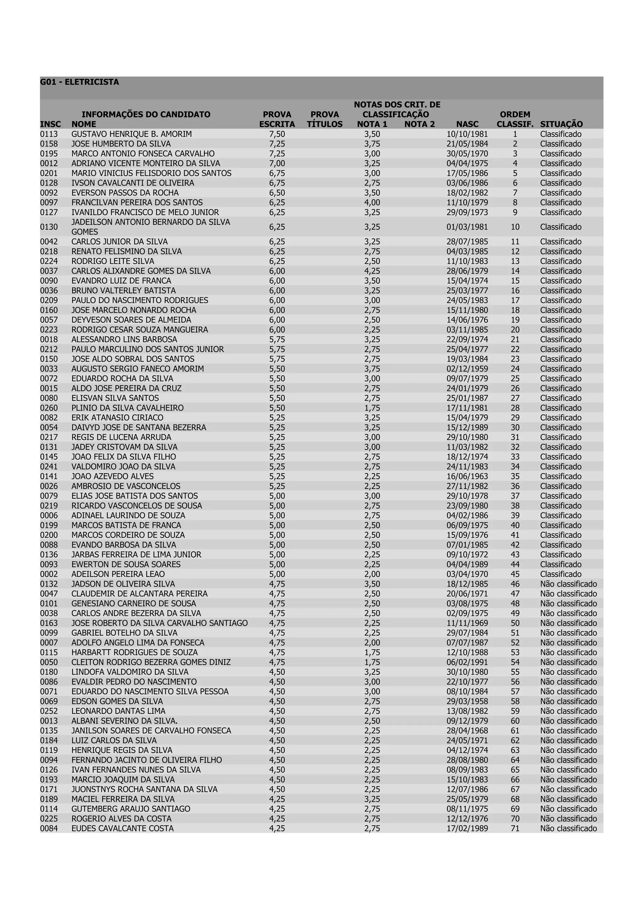 Este documento apresenta os resultados de uma prova para eletricista, classificando 96 candidatos de acordo com suas notas na prova escrita e títulos. Gustavo Henrique B. Amorim ficou em primeiro lugar, enquanto 47 candidatos não foram classificados.