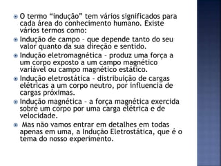 O documento descreve o processo de indução eletrostática, no qual um corpo carregado (indutor) pode induzir cargas em um corpo próximo (induzido). Aproximando um canudo eletrizado negativamente de um pedaço de papel alumínio, os elétrons no papel são repelidos para cima, deixando as pontas positivamente carregadas e separadas por repulsão eletrostática.
