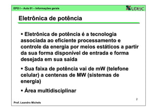 O documento apresenta uma introdução à disciplina de Eletrônica de Potência, definindo o assunto, suas áreas de conhecimento associadas e métodos de processamento de energia. Também classifica e descreve os principais tipos de conversores estáticos, dispositivos associados e suas aplicações com foco em conversores comutados pela linha e completamente controláveis.