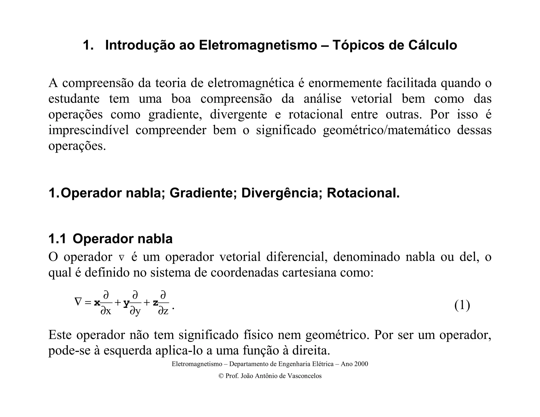 O documento apresenta os principais conceitos matemáticos relacionados ao eletromagnetismo, como operador nabla, gradiente, divergência e rotacional. Explica o significado geométrico e físico dessas grandezas vetoriais diferenciais e mostra exemplos de suas aplicações.