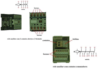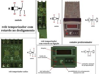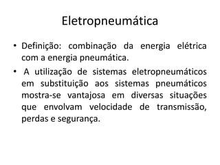 O documento discute eletropneumática, definindo-a como a combinação da energia elétrica com a pneumática. Descreve os principais componentes de entrada e saída de sinais em sistemas eletropneumáticos, como botoeiras, chaves fim de curso e sensores de proximidade, e como estes componentes funcionam.