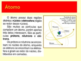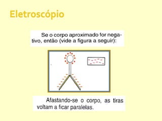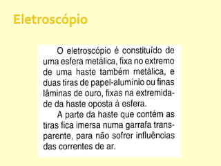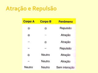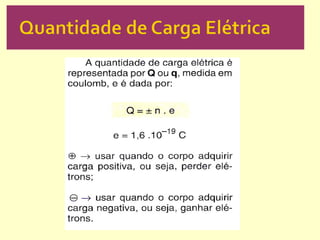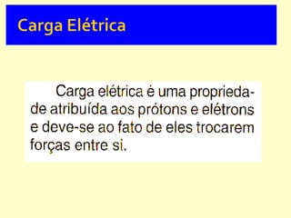 O documento resume conceitos básicos sobre átomos e eletrização. Explica que átomos são compostos por prótons com carga positiva e elétrons com carga negativa. Também diferencia condutores e isolantes elétricos e descreve três processos de eletrização: por atrito, contato e indução.