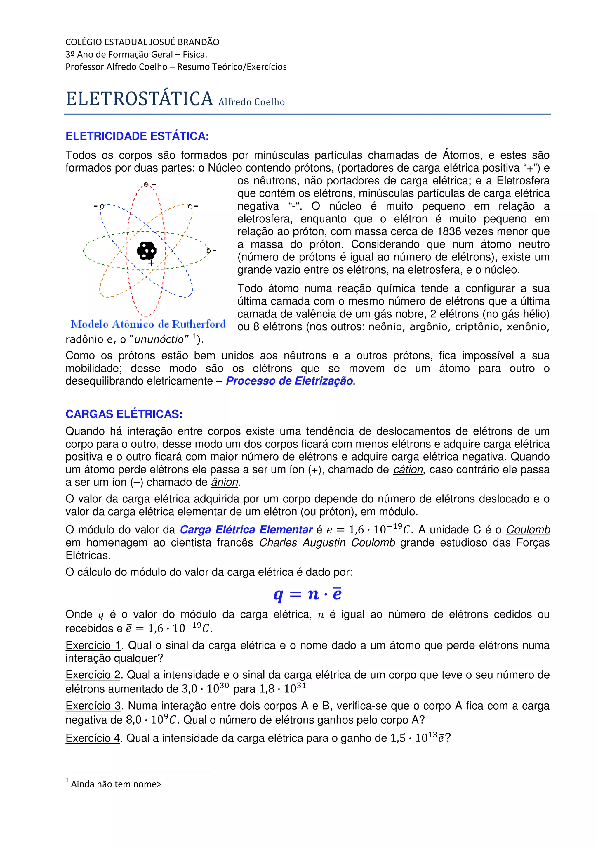 O documento resume conceitos fundamentais de eletrostática, incluindo: 1) a estrutura atômica e o processo de eletrização; 2) os tipos de carga elétrica e como são geradas; 3) as propriedades das cargas elétricas, incluindo atração e repulsão. O texto também explica a lei de Coulomb, campo elétrico e força elétrica. Exercícios ilustram esses conceitos.