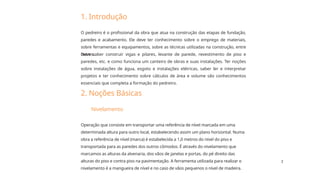 O documento aborda o curso de pedreiro, detalhando as funções e conhecimentos essenciais desse profissional, incluindo técnicas de construção, uso de ferramentas e leitura de projetos. Discute também o preparo de materiais, como concreto e argamassa, e os diferentes tipos de materiais de construção, suas propriedades e utilizações. Além disso, menciona a importância de calcular áreas e volumes, junto com práticas de segurança e manuseio de materiais.