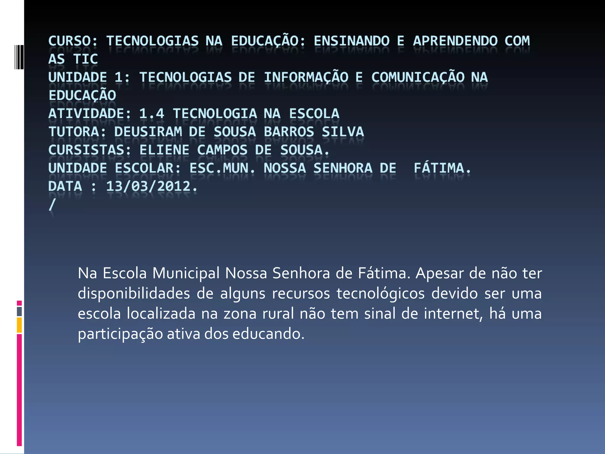A Escola Municipal Nossa Senhora de Fátima, localizada na zona rural sem acesso à internet, tem quatro professores que usam tecnologias educacionais como textos impressos e digitais, vídeos, áudio, jogos e simulações, apesar de trabalharem em salas com várias séries.