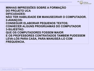 Este documento resume as impressões de Elineide Maria Rolim da Purificação sobre sua formação no Projeto UCA. Ela destaca como dificuldades iniciais não ter habilidade com computadores e como avanços conseguir elaborar pequenos textos e conhecer alguns programas. Ela sugere que os computadores fossem maiores e que os professores pudessem levar os equipamentos para casa para mais prática.