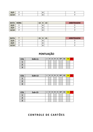 O documento descreve as eliminatórias da 1a Supercopa da Liga Serrana de Futebol Infantil de 2012. A fase inicial consiste em confrontos entre 7 times nas categorias sub-11, sub-13 e sub-15. Os vencedores se classificam para o triangular final para definir os 2 times que conquistarão vaga na Supercopa. O documento também lista as datas e horários dos jogos, a arbitragem e o controle de cartões.