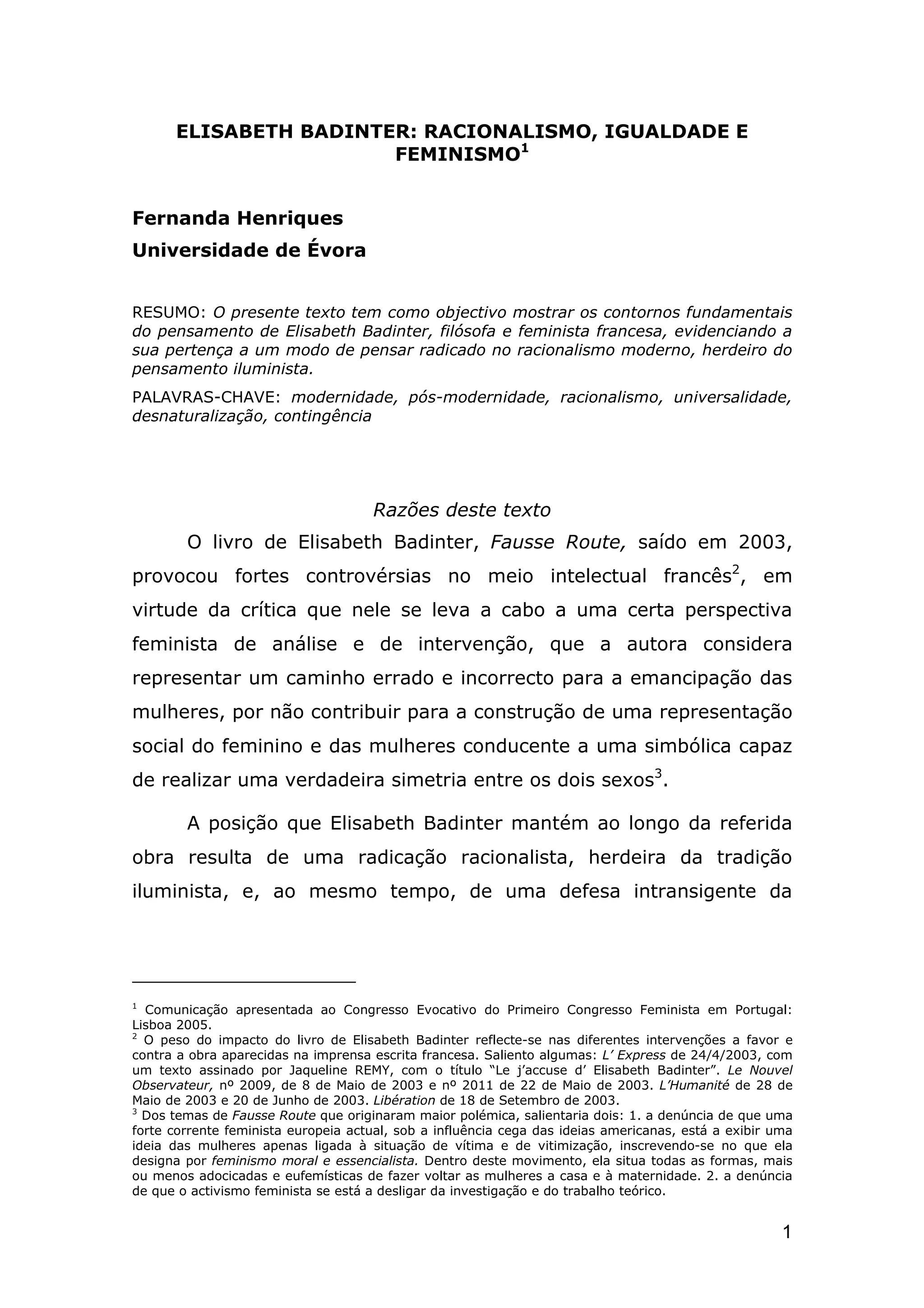 Este documento resume o pensamento da filósofa feminista francesa Elisabeth Badinter, que defende uma perspectiva racionalista e igualitária do feminismo, herdeira do Iluminismo. O documento analisa a polêmica gerada pelo livro de Badinter "Fausse Route" e discute como o feminismo pode dialogar entre a modernidade e a pós-modernidade de forma consistente e eficaz.
