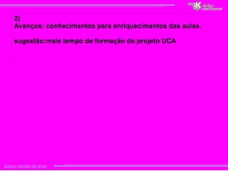 Este documento discute as impressões de uma aluna sobre sua formação no projeto UCA. Ela aponta duas dificuldades iniciais: falta de conhecimento sobre o programa Linux. No entanto, também destaca os avanços, como os novos conhecimentos que enriqueceram suas aulas. A aluna sugere que mais tempo seja dedicado à formação no projeto.