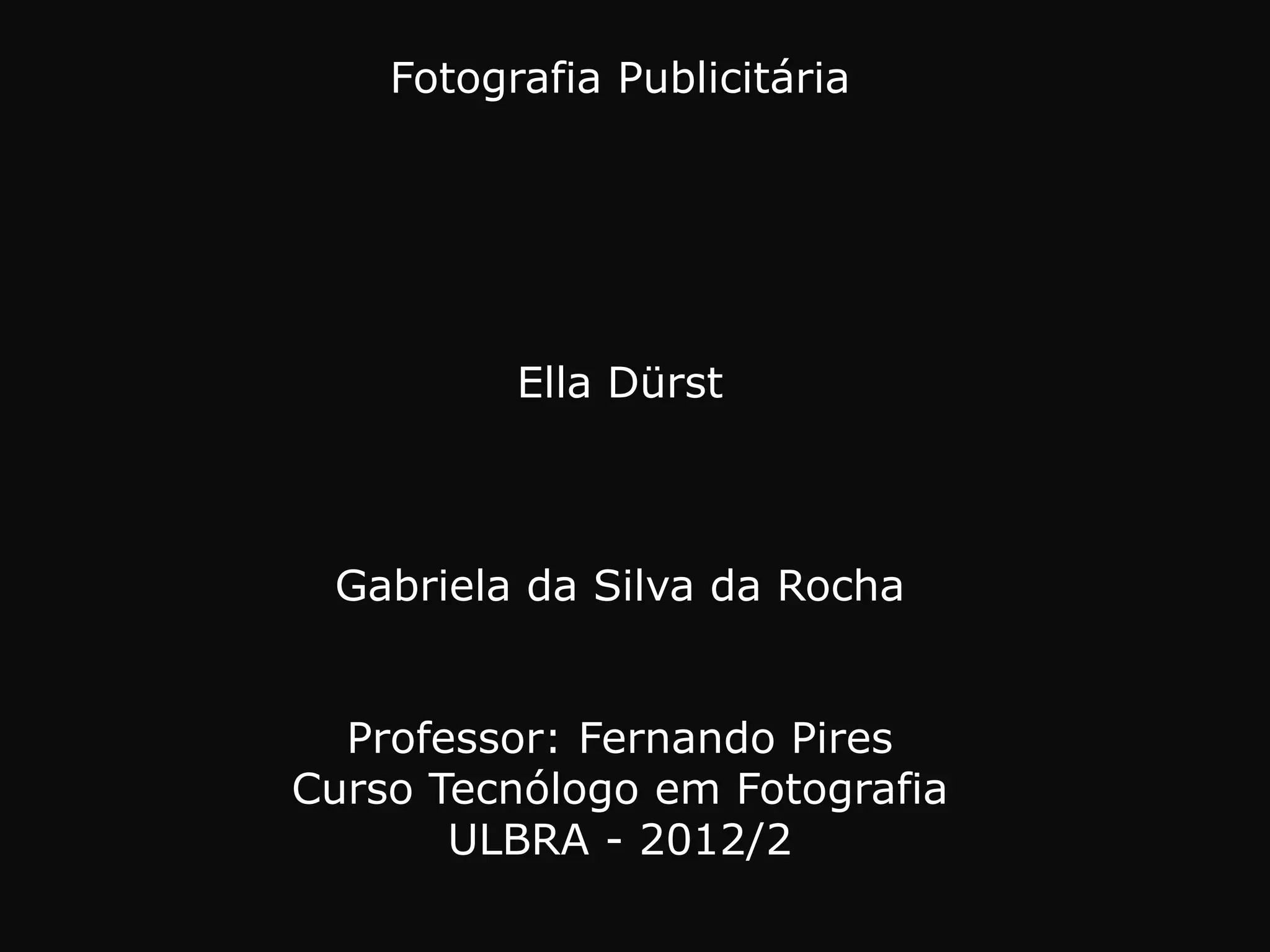 Este documento fornece um breve resumo biográfico da fotógrafa brasileira Ella Dürst, destacando que ela se formou em cinema na USP, lecionou fotografia estética na TV Cultura e trabalhou no Jornal da Tarde, e atualmente é reconhecida como uma das principais fotógrafas de moda do Brasil.