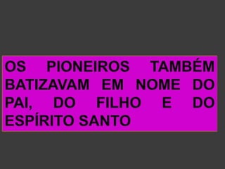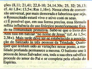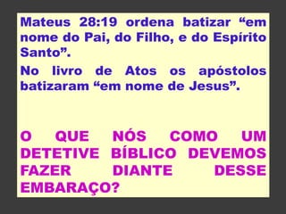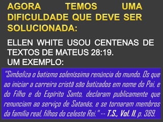 Este documento discute a formula batismal em Mateus 28:19 e as visões de Ellen White e os pioneiros adventistas sobre o assunto. Apresenta argumentos de que a formula pode ter sido alterada no segundo século e que Ellen White e os pioneiros não acreditavam na Trindade, apenas que o Pai, Filho e Espírito Santo representavam Deus, Cristo e o poder de Deus. Conclui que maior luz pode ser lançada sobre estas e outras verdades bíblicas.
