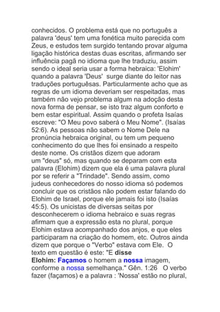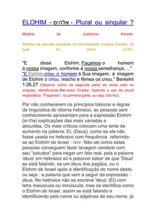Este documento discute o uso da palavra hebraica "Elohim" na Bíblia e explica que, embora tenha um sufixo plural, ela é usada de forma majestática para se referir a Deus como um único ser. Ele fornece exemplos bíblicos que mostram que os verbos e adjetivos associados a Elohim estão no singular, indicando que se refere a um único Deus, não uma trindade ou outros deuses. O documento conclui que Elohim se refere exclusivamente ao Deus de Israel.