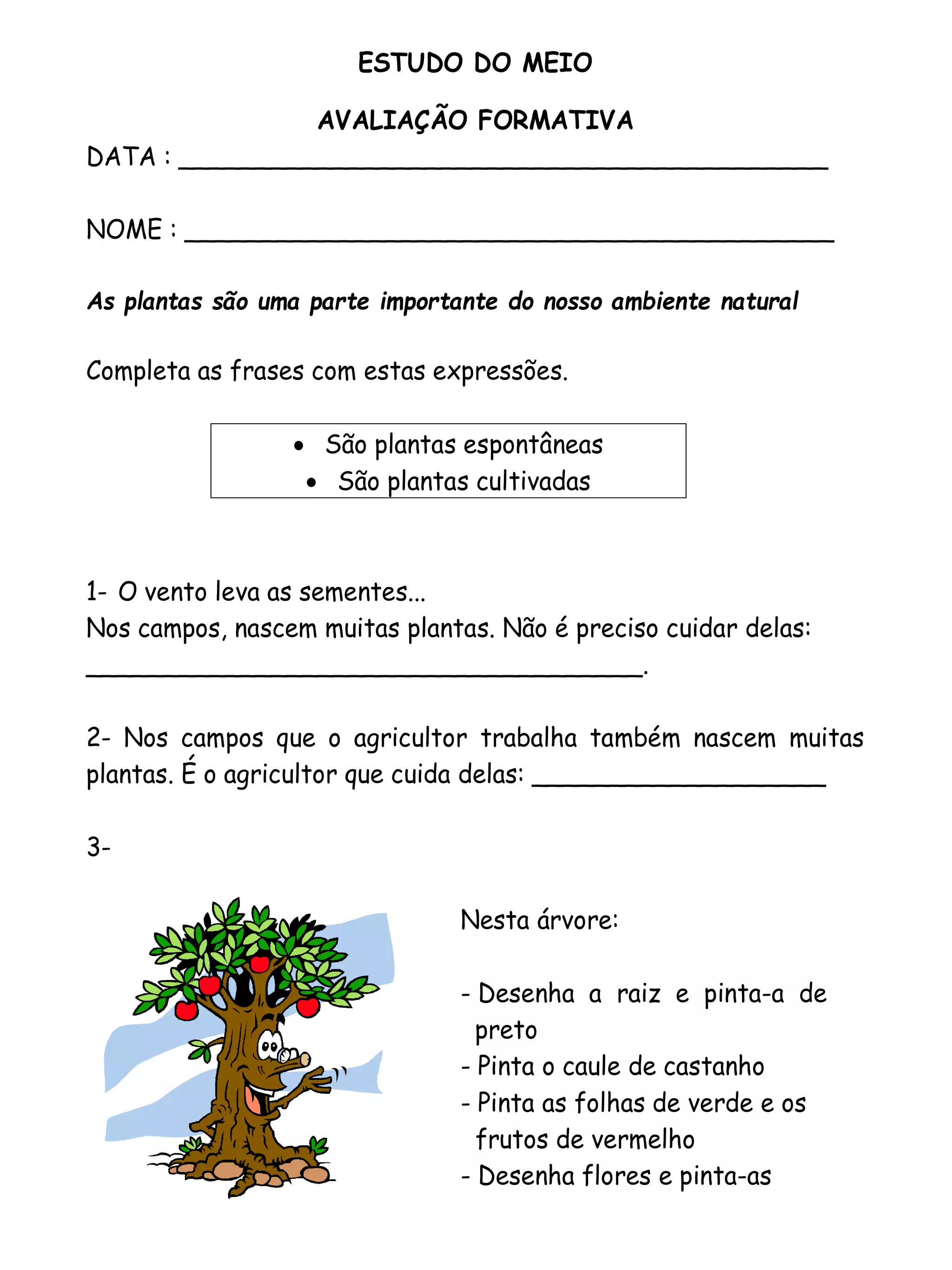 O documento fala sobre plantas espontâneas e cultivadas. Ele fornece frases incompletas para serem completadas com "São plantas espontâneas" ou "São plantas cultivadas". Também pede para desenhar e colorir uma árvore específica.