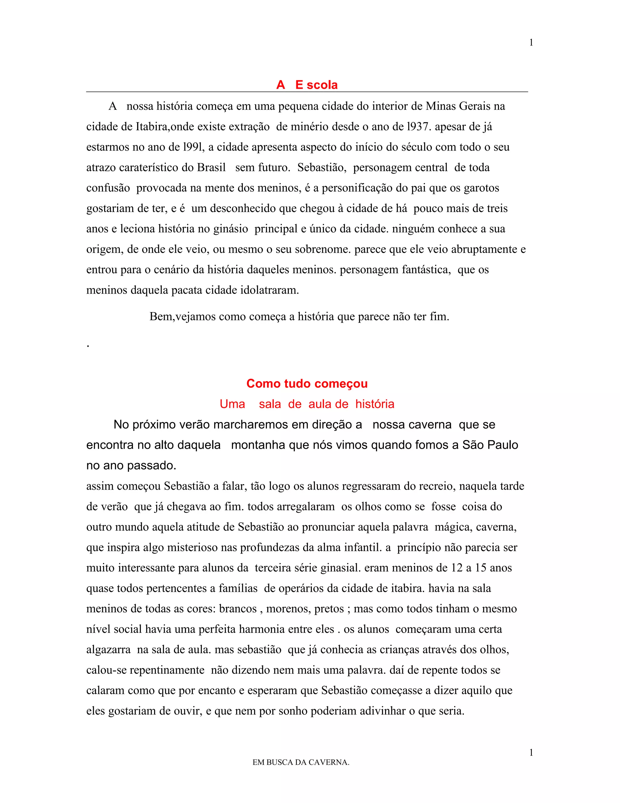 Este documento descreve como um professor chamado Sebastião começou a contar histórias sobre uma misteriosa caverna para seus alunos, despertando neles o desejo de explorá-la. Os alunos começaram a se reunir para planejar a viagem. No entanto, eles agora querem ir à caverna imediatamente, colocando Sebastião em uma situação difícil.