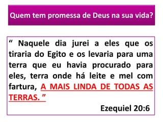 Este documento discute as promessas de Deus para o povo judeu e como eles inicialmente duvidaram e não acreditaram em receber a Terra Prometida. Apresenta a história dos 12 espiões enviados para explorar Canaã e como 10 trouxeram um relatório negativo, fazendo o povo duvidar. Apenas Calebe e Josué tiveram fé nas promessas de Deus.