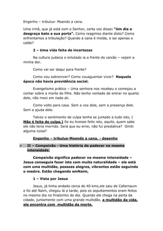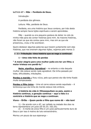 O documento descreve a história bíblica de Jesus ressuscitando o filho único de uma viúva em Naim. Ele resume a história em três pontos: (1) a tribulação da viúva ao perder seu marido e filho; (2) a compaixão de Jesus por seu sofrimento; (3) a adoração resultante quando Jesus traz o filho de volta à vida. A lição é que as mães devem contar as histórias e visitas de Deus em suas vidas.
