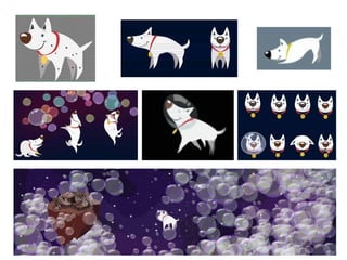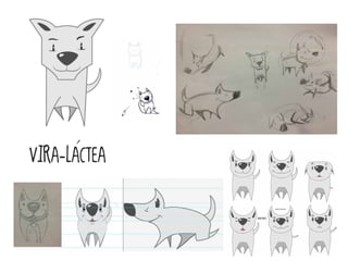 3) Desenhos conceituais dos personagens Buga e A Buga e dos cenários incluindo a Terra, uma nebulosa e planetas com cipós e crateras.