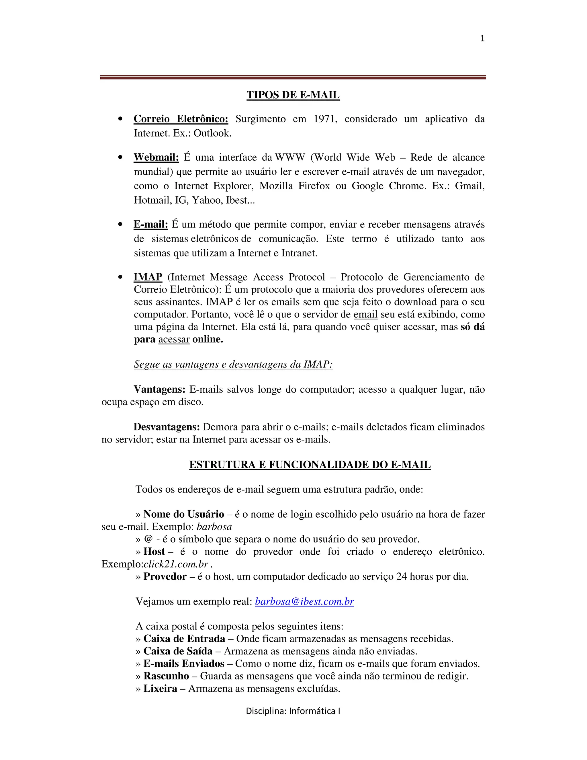 O documento descreve os principais tipos de e-mail, como correio eletrônico, webmail e IMAP. Também explica a estrutura de um endereço de e-mail e as partes principais de uma caixa postal como caixa de entrada, saída e enviados.