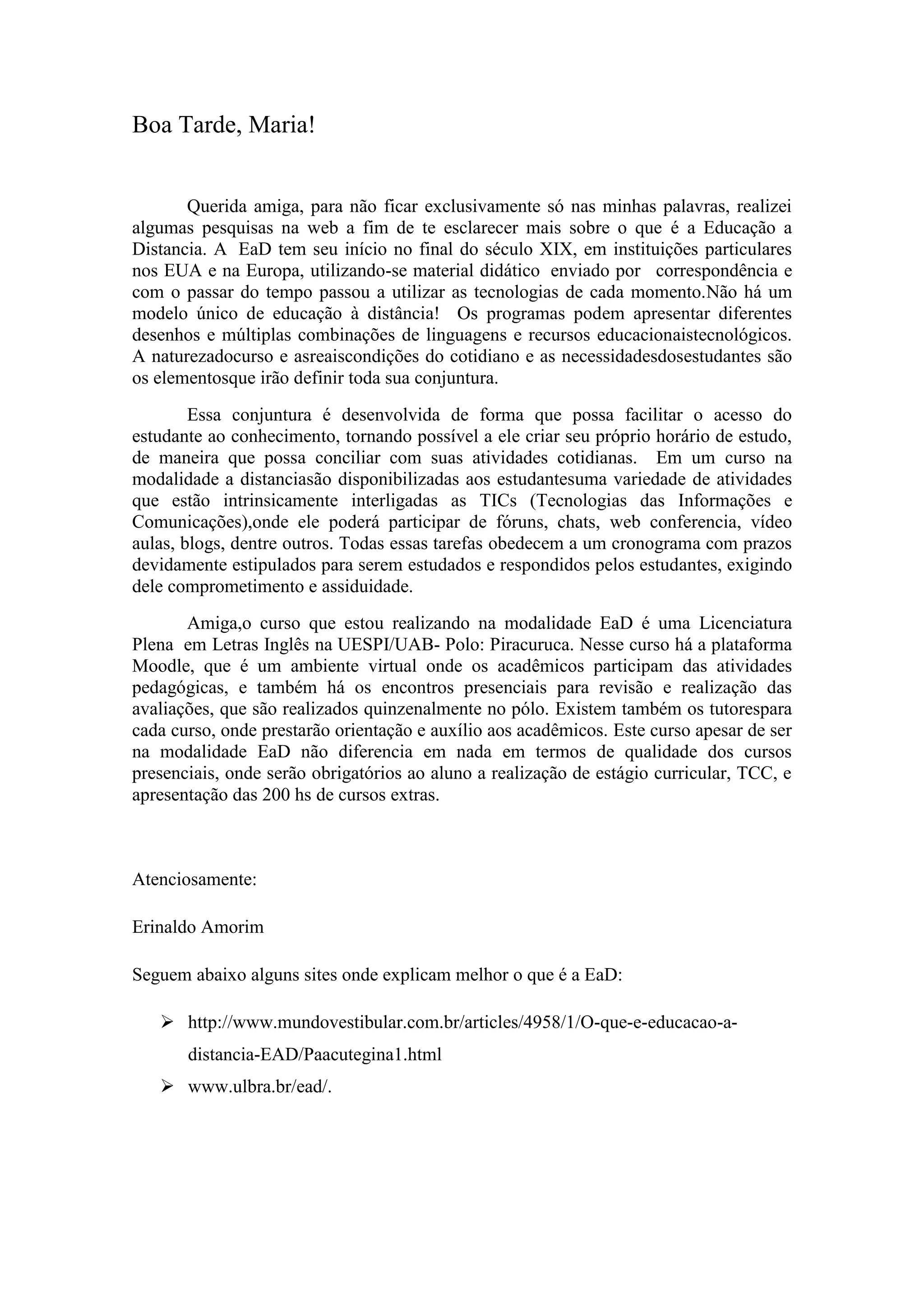 A educação a distância (EaD) começou no século 19 usando material didático por correspondência. Hoje usa tecnologias como chats, vídeos e fóruns. O curso do autor de EaD em Letras Inglês usa a plataforma Moodle com atividades online e encontros quinzenais presenciais.