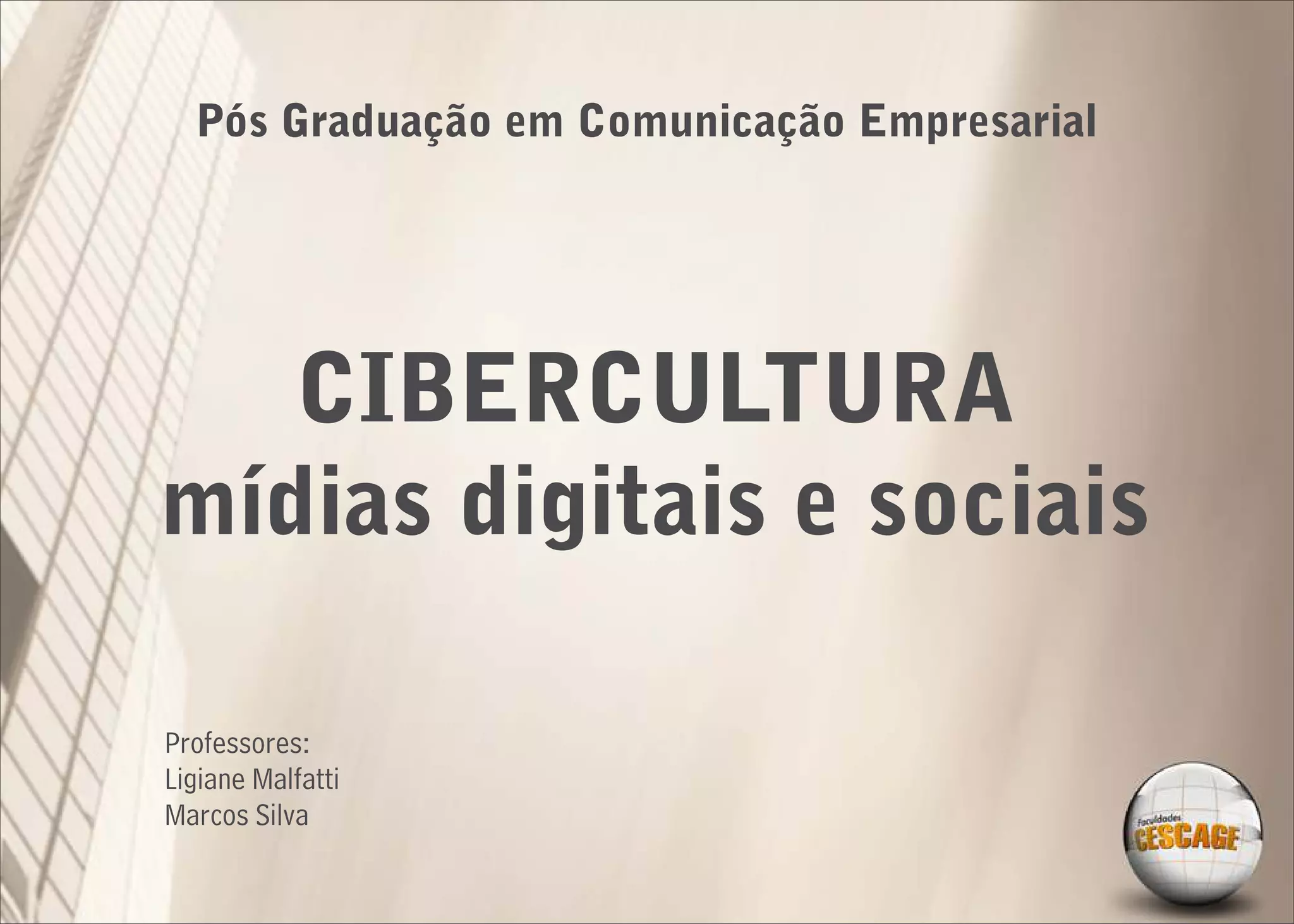 O documento discute o planejamento de um curso sobre mídias digitais e sociais, abordando tópicos como conectividade da população, formas de atuação no ambiente digital, mídias digitais tradicionais e impactos da interatividade. A avaliação dos alunos incluirá participação em discussões no Facebook e identificação de casos de sucesso no universo digital.