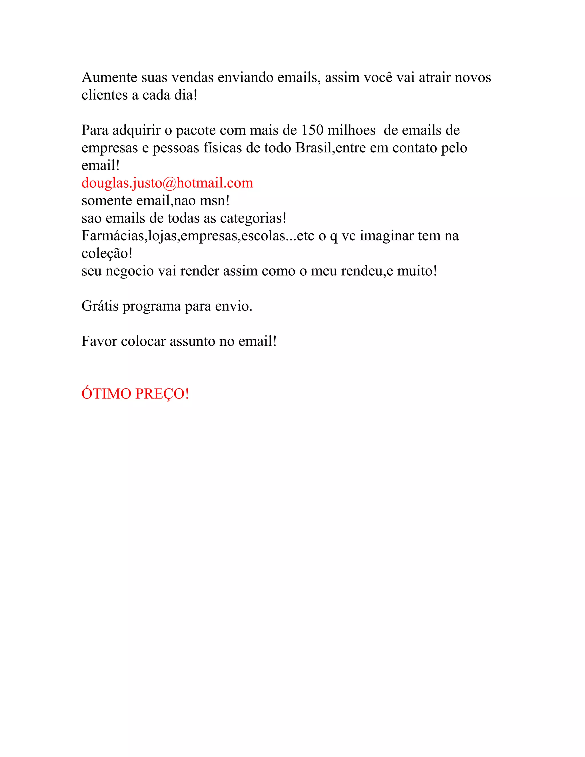 Um vendedor oferece um pacote com mais de 150 milhões de endereços de e-mail brasileiros para aumentar as vendas de empresas, cobrando um preço acessível e fornecendo uma ferramenta gratuita para envio de e-mails, sugerindo que seu negócio também terá sucesso com esta estratégia.