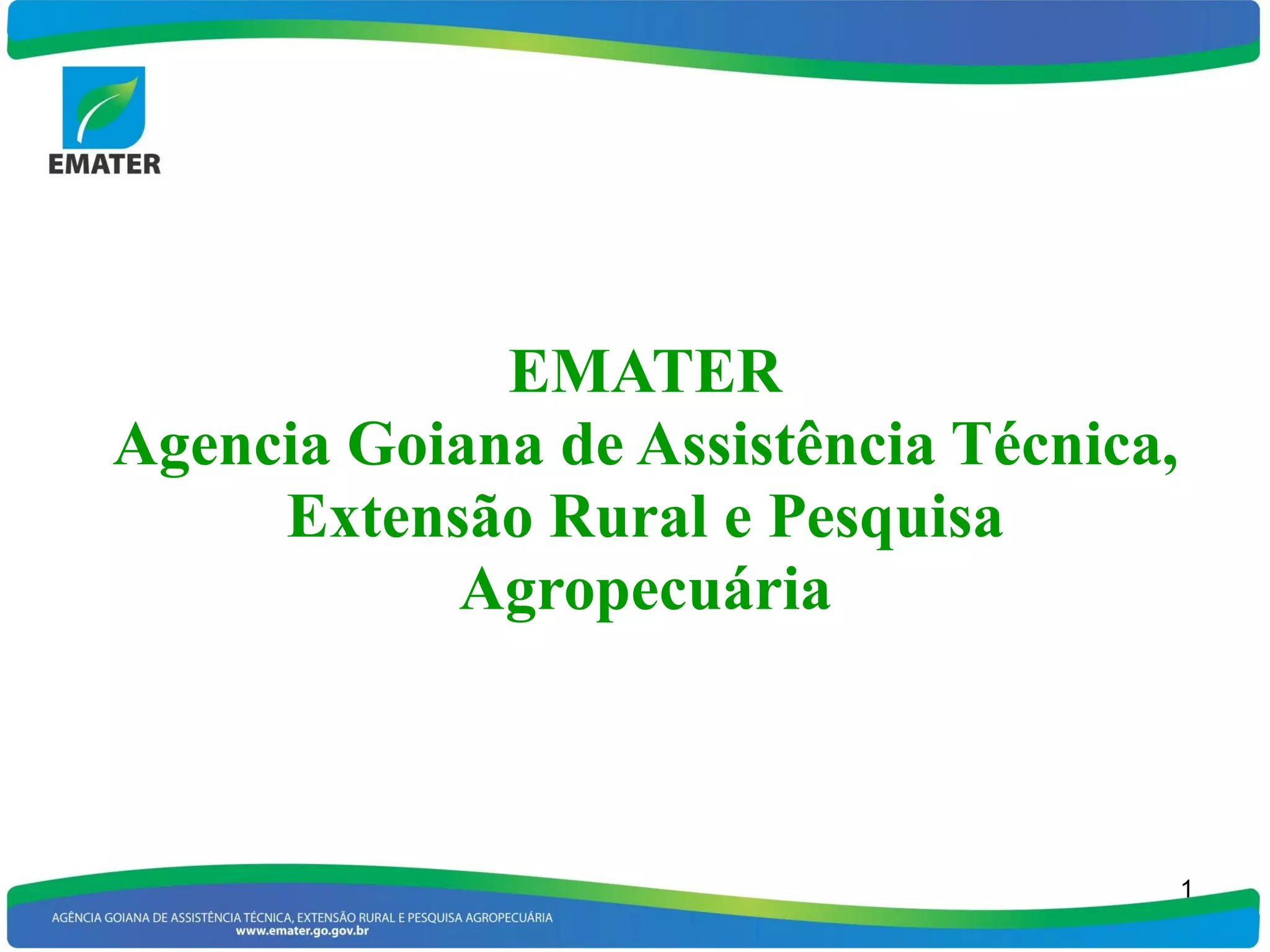 O documento descreve a história e as atividades da EMATER, a agência de assistência técnica e extensão rural do estado de Goiás. A EMATER fornece assessoramento técnico a agricultores familiares e assentados, realiza pesquisas agropecuárias e projetos de desenvolvimento rural. Em 2011, a EMATER atendeu mais de 20 mil agricultores familiares e elaborou milhares de projetos de financiamento rural.