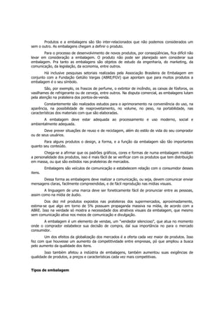 O documento discute as funções e tipos de embalagens. Embalagens protegem produtos, facilitam transporte e armazenamento, e são importantes ferramentas de marketing. Há embalagens primárias, secundárias e terciárias, cada uma com funções específicas relacionadas à produção, distribuição e venda. Embalagens devem ser projetadas considerando fatores como logística, marketing e segurança do produto.