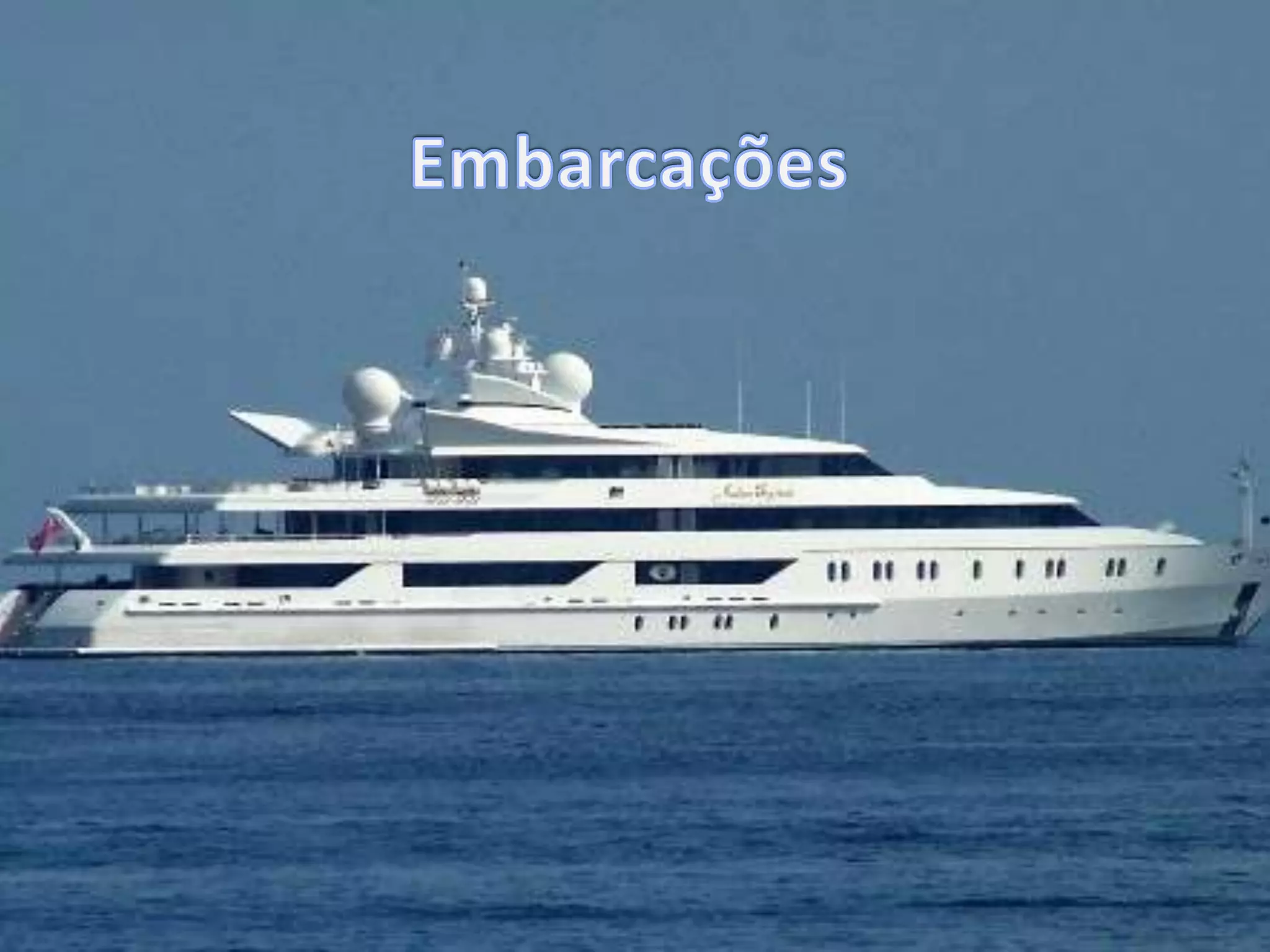O documento descreve embarcações, incluindo o que são, sua importância e alguns tipos. Ele define embarcações como qualquer construção para navegação e divide-os em tipos como barcos e navios. Ele explica que embarcações transportam carga e pessoas e são importantes para o transporte marítimo e fluvial. O documento também lista partes principais de embarcações e exemplifica tipos como cruzeiros, cargueiros e submarinos.