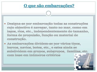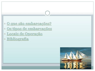 O documento lista vários links sobre tipos de embarcações, locais de operação e biografia. Inclui links para páginas da Wikipédia sobre embarcações, transporte e categorias de tipos de embarcações, além de links para sites sobre tipos de navios, barcos de pesca e lazer.