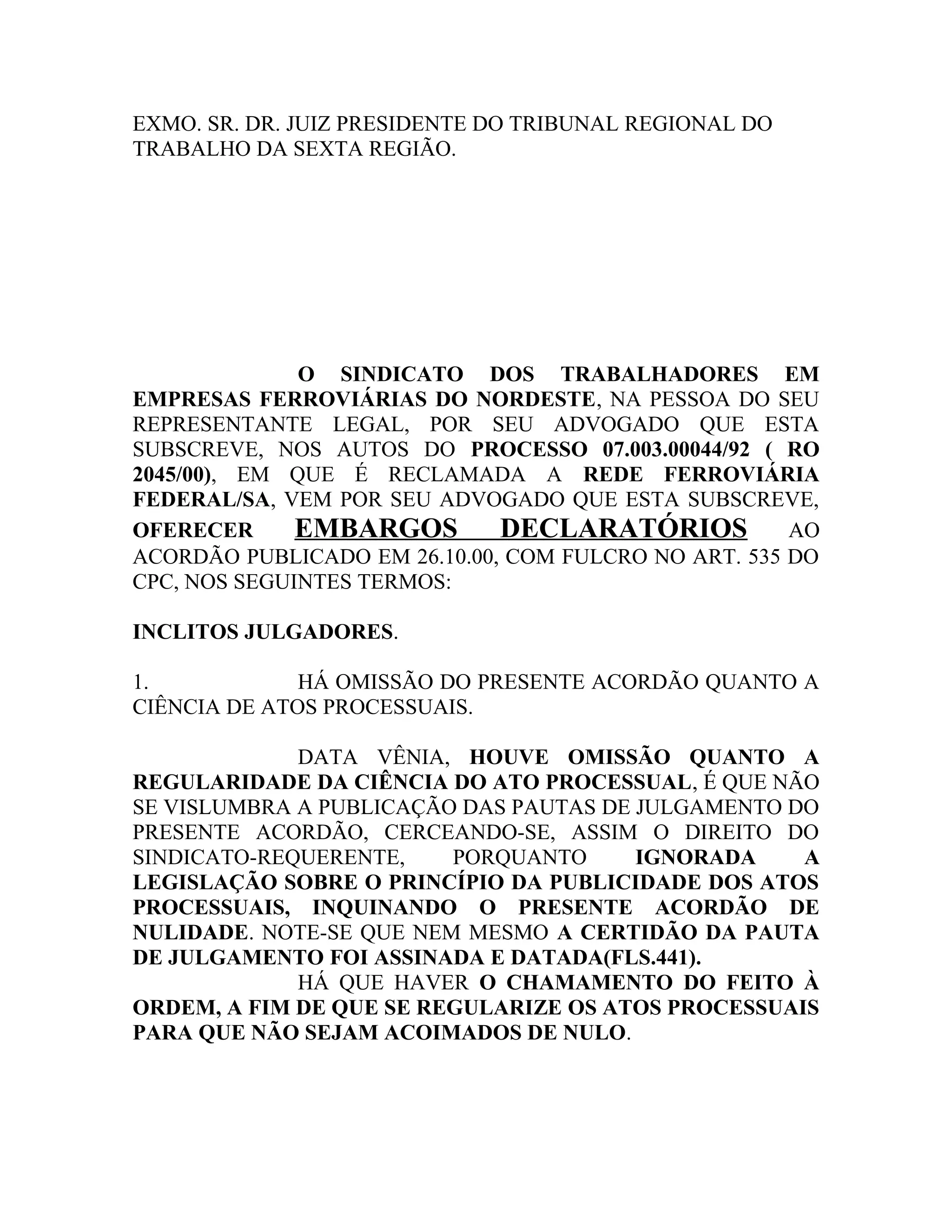 O sindicato move embargos declaratórios contra o acórdão do tribunal regional do trabalho. Alega (1) omissão quanto à regularidade da ciência dos atos processuais e (2) omissão sobre a primeira preliminar arguida no recurso, relativa à nulidade da sentença de embargos declaratórios. Pede que os embargos sejam acolhidos para reforma da sentença e envio do processo ao juízo de origem.