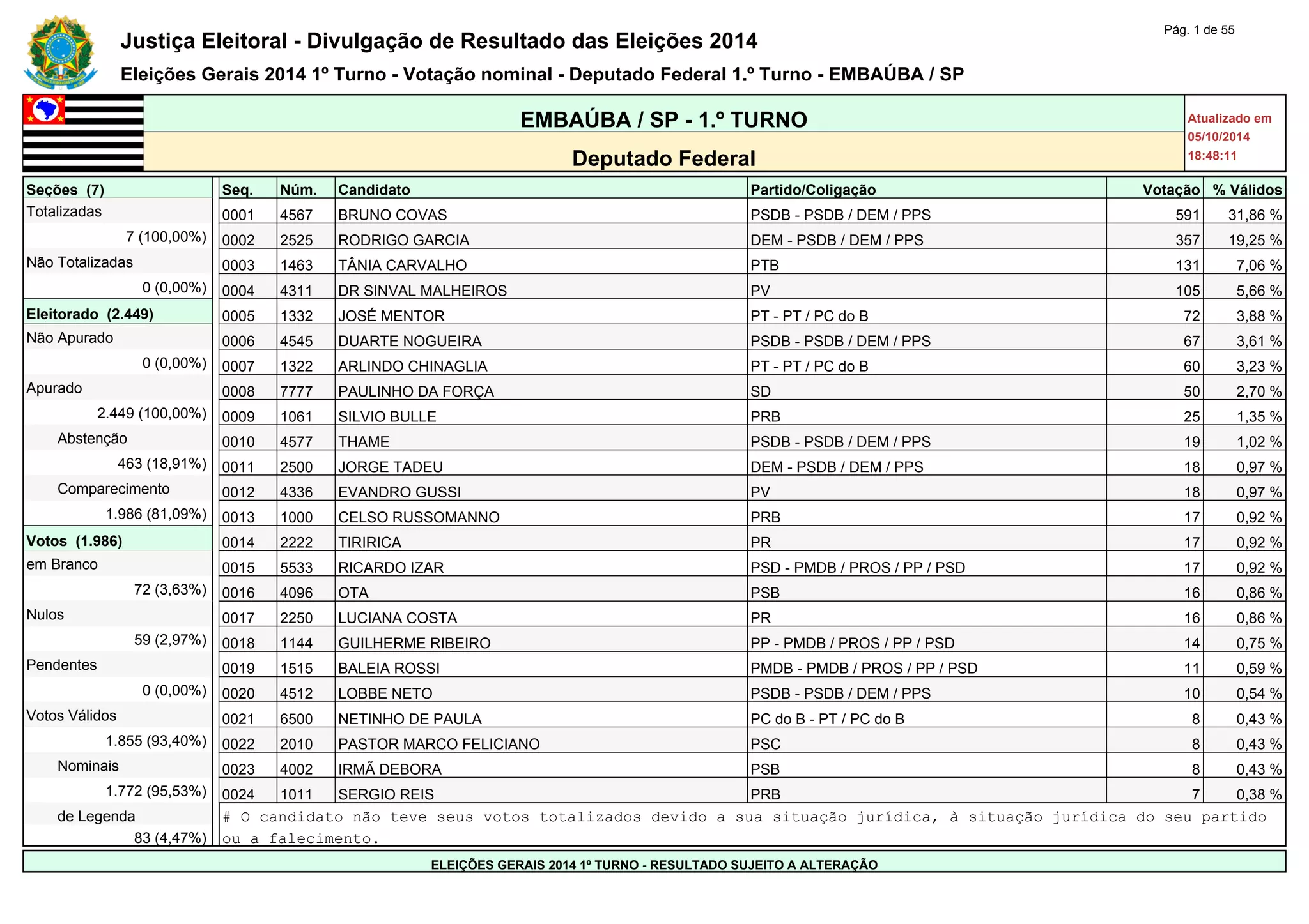 Bruno Covas do PSDB recebeu o maior número de votos, 591 (31,86%). Rodrigo Garcia do DEM ficou em segundo com 357 votos (19,25%). No total, 1.986 pessoas votaram e 1.855 votos foram considerados válidos.