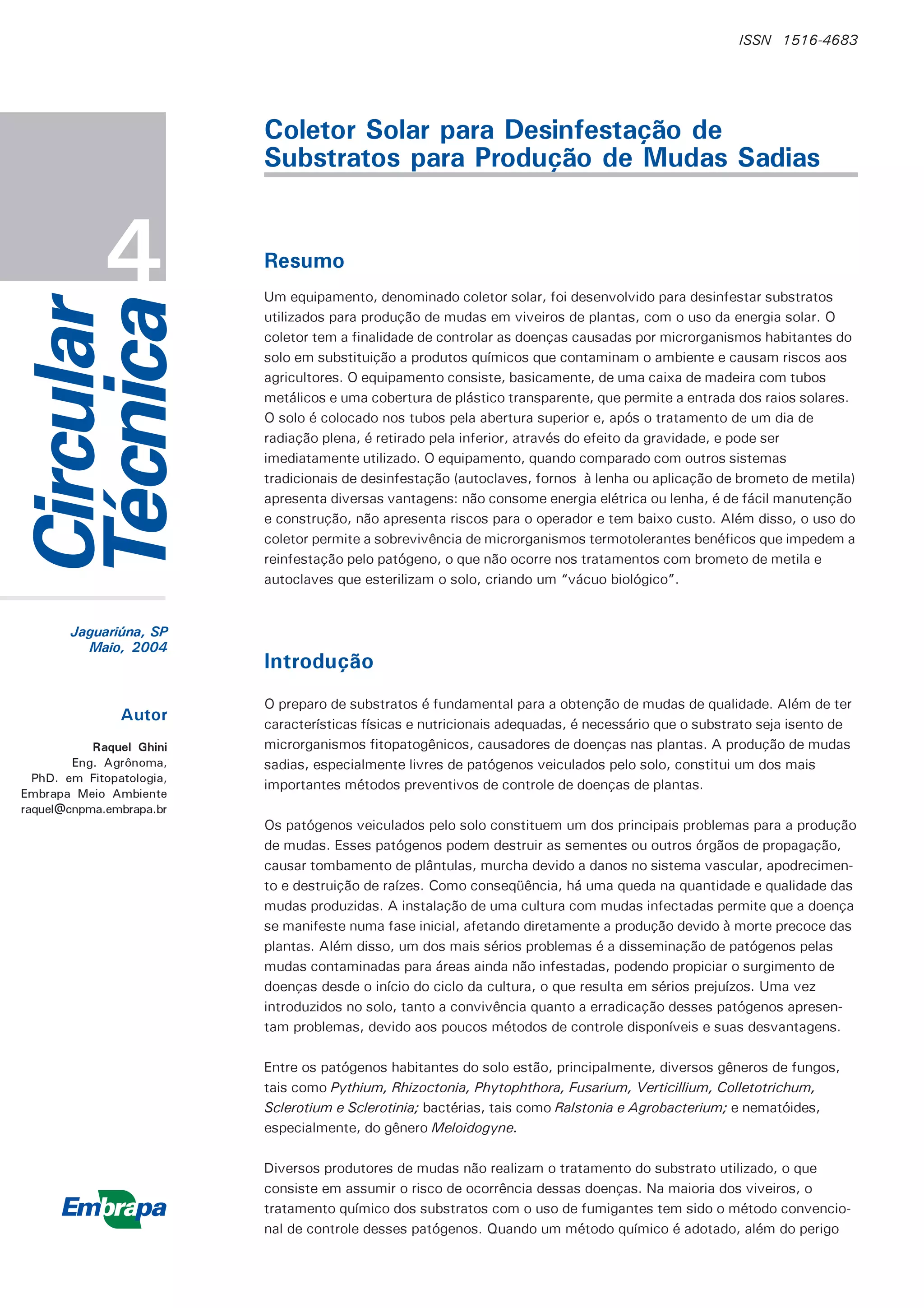 O documento descreve um equipamento chamado coletor solar que desinfesta substratos usados para produção de mudas, usando energia solar em vez de produtos químicos. O coletor consiste em uma caixa de madeira com tubos de metal e cobertura plástica transparente. O substrato é colocado nos tubos, tratado por um dia de radiação e retirado, podendo ser usado imediatamente. O coletor é uma alternativa ecológica e barata para desinfestar substratos.