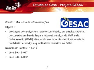 Este documento descreve o projeto GESAC, um projeto do Ministério das Comunicações para fornecer serviços de banda larga, VoIP e redes sem fio para 11.919 pontos em todo o Brasil. O projeto exigia a implantação de uma rede VSAT em 90 dias. A solução adotada foi utilizar a plataforma Gilat SkyEdge II com duas HUBs e mais de 11 mil VSATs. O desafio foi implantar a infraestrutura e ativar as VSATs dentro do prazo exigido devido à extensão territorial