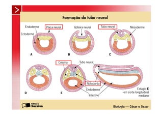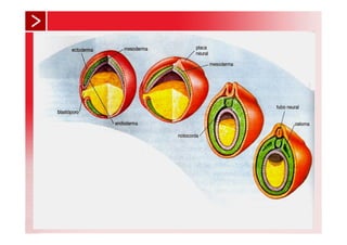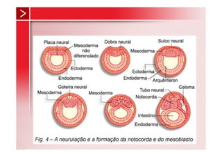 O documento resume os principais processos da fecundação e desenvolvimento embrionário, incluindo a segmentação, gastrulação, neurulação e formação de anexos embrionários como a vesícula vitelínica, âmnio e placenta.