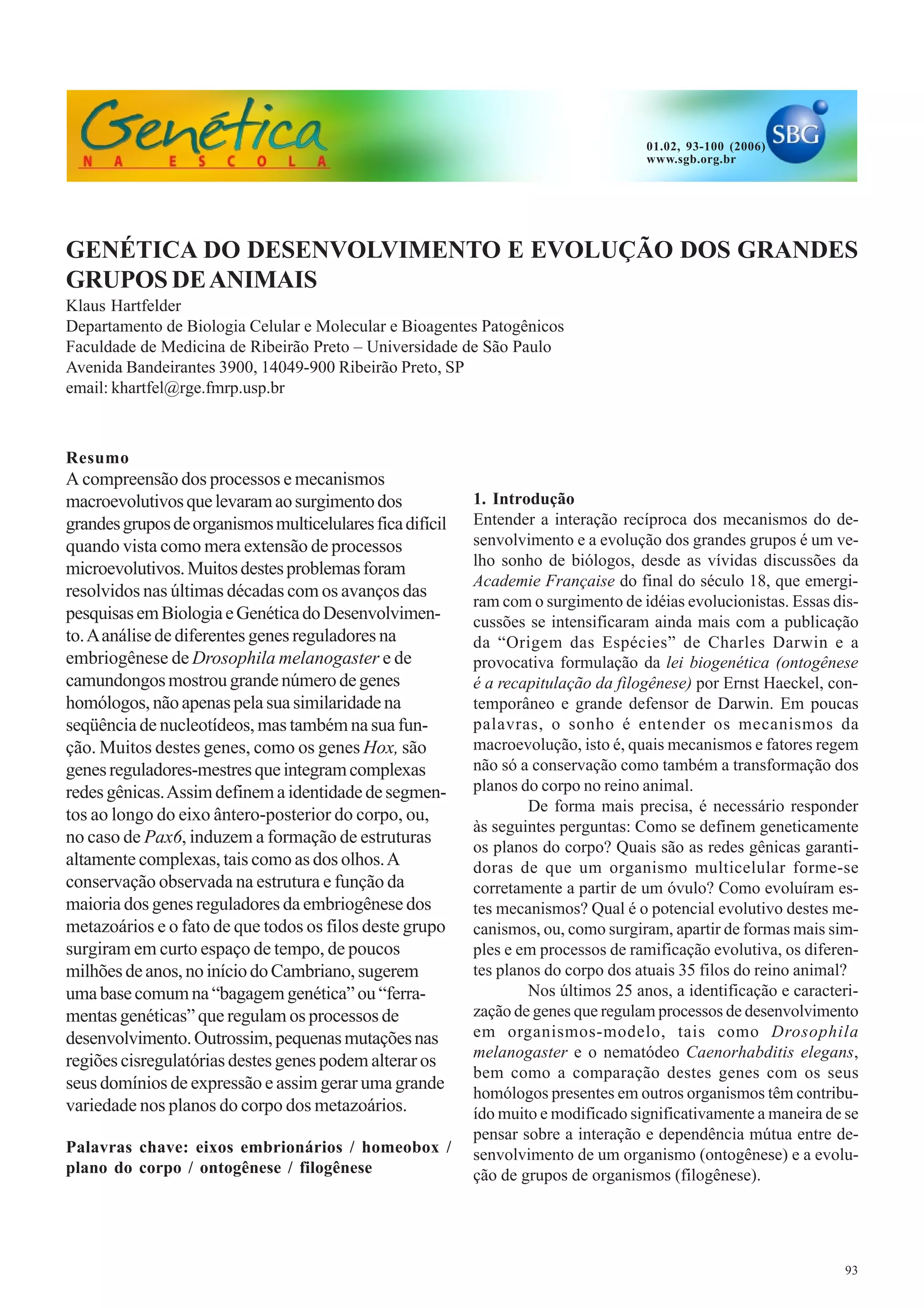 1) O documento discute a evolução dos grandes grupos de animais e como os mecanismos genéticos do desenvolvimento influenciaram essa evolução.