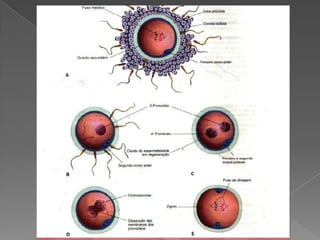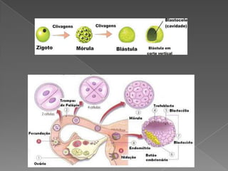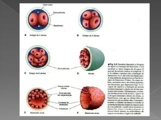 O documento descreve as etapas do desenvolvimento embrionário desde a fertilização até a organogênese. Inclui gametogênese, fertilização, clivagem, blastulação, implantação e início da diferenciação dos tecidos.