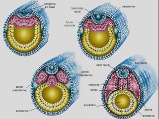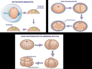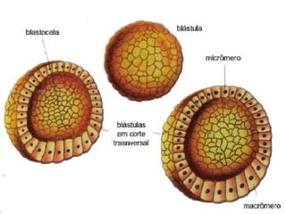 O documento descreve os principais conceitos da embriologia, incluindo os estágios de desenvolvimento embrionário, os tipos de segmentação e óvulos, os folhetos embrionários e os anexos embrionários.