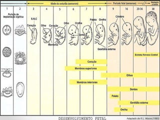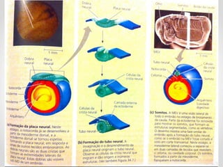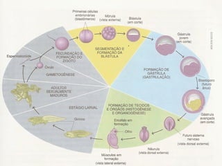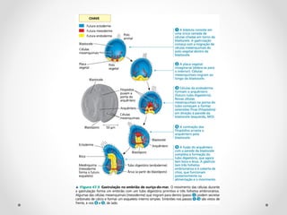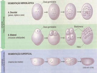 O documento descreve os principais tipos de ovos animais, os processos de segmentação, gastrulação e neurulação durante o desenvolvimento embrionário e os anexos embrionários. Os tipos de ovos são classificados de acordo com a distribuição do vitelo e incluem ovos oligolécito, mediolécito e megalécito. A segmentação, gastrulação e neurulação formam os três folhetos germinativos e definem o plano corporal do embrião. Os principais anexos embrionários são a vesícula vitelín