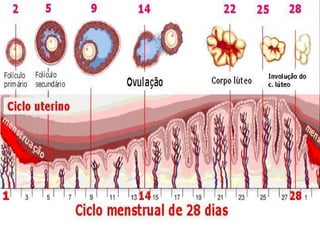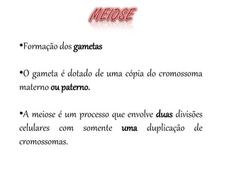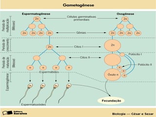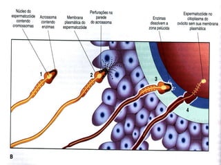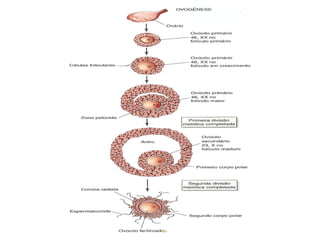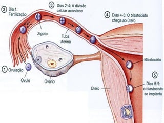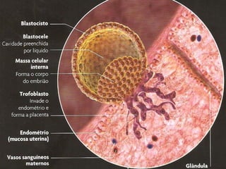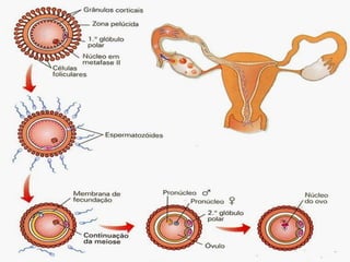O documento descreve as etapas da formação dos gametas e da reprodução humana, incluindo a meiose, espermatogênese e ovogênese, fertilização e desenvolvimento embrionário até a implantação no útero.