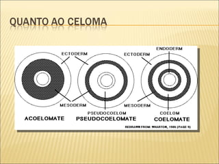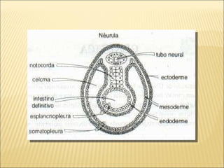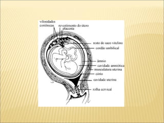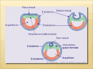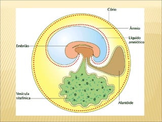 1) O desenvolvimento embrionário estuda o desenvolvimento do ovo desde a fecundação até a forma adulta, iniciando com a formação do zigoto e diferenciação celular. 2) Os ovos podem ser classificados de acordo com a quantidade e distribuição do vitelo em oligolécitos, telolécitos incompletos, telolécitos completos e centrolécitos. 3) A segmentação pode ser holoblástica igual ou desigual, ou meroblástica discoidal ou superficial, dependendo da quantidade de vitelo.