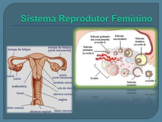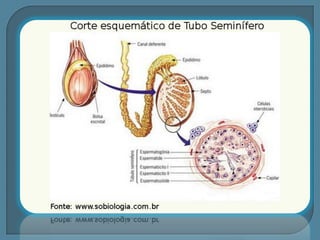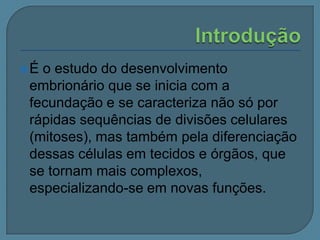 O documento descreve as etapas do desenvolvimento embrionário e da gametogênese masculina e feminina, incluindo a meiose e a espermatogênese. Resume os principais eventos da embriogênese, como a clivagem, formação do blastocisto e das três camadas germinativas, e as fases do desenvolvimento fetal.