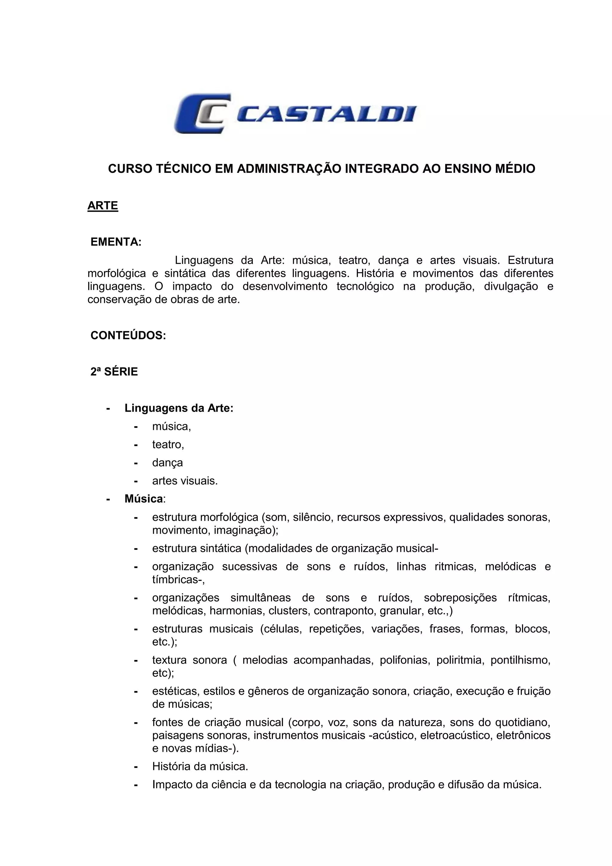 Este documento apresenta o currículo de um curso técnico em administração integrado ao ensino médio. Ele inclui ementas e conteúdos programáticos para as disciplinas de Arte e Biologia, com foco nas linguagens artísticas, história da arte, biologia celular, classificação dos seres vivos, ecologia e genética.