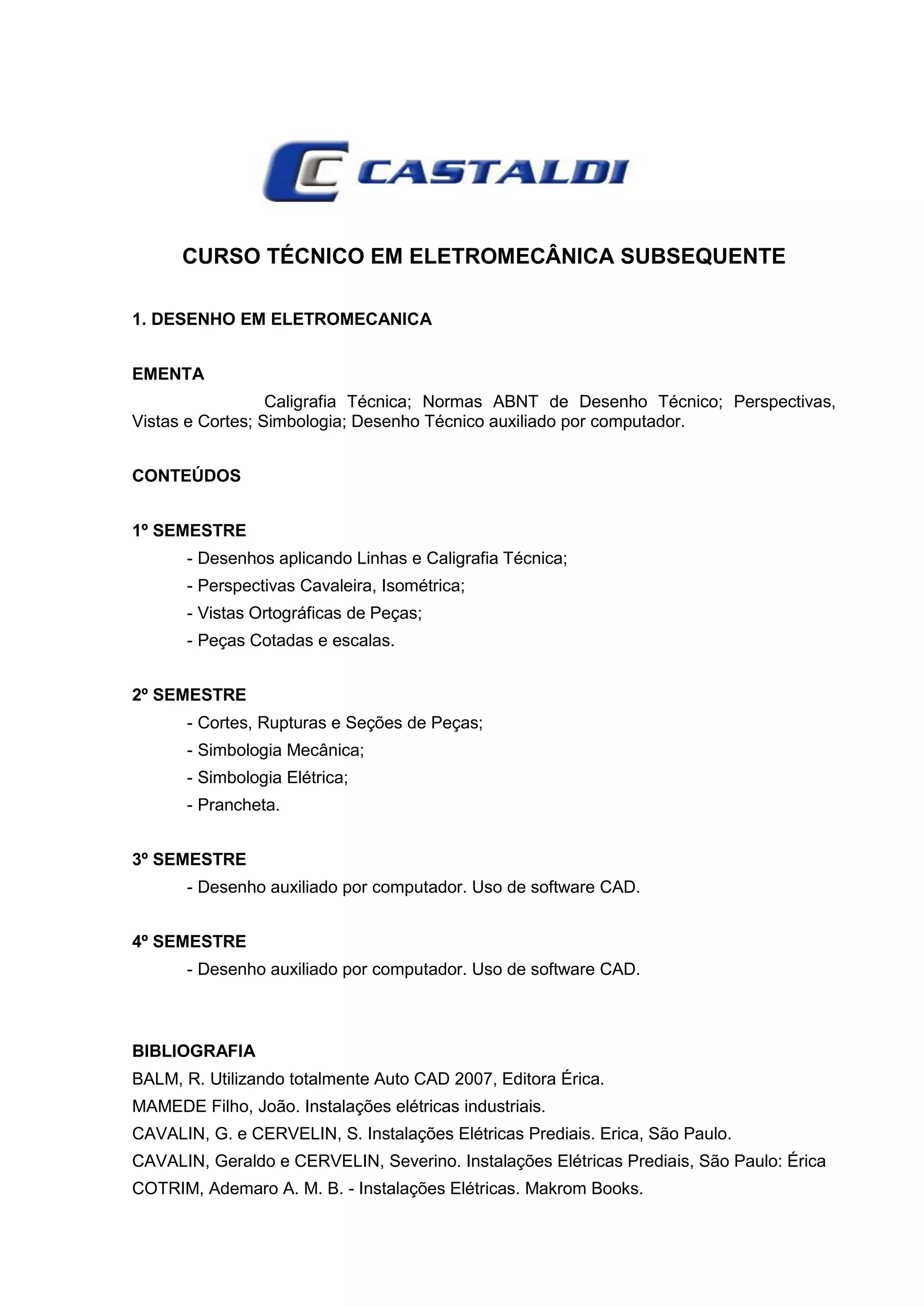 Este documento descreve o currículo de um curso técnico subsequente em eletromecânica. O currículo inclui disciplinas como desenho técnico, eletricidade, eletrônica, fundamentos do trabalho, inglês técnico e introdução à eletromecânica. Cada disciplina apresenta ementa, conteúdos programáticos e bibliografia de referência.