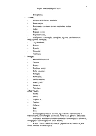 Este documento descreve o currículo de um curso técnico em eletrotécnica. A primeira parte apresenta o conteúdo da disciplina de arte, incluindo as diferentes linguagens artísticas como música, teatro, dança e artes visuais. A segunda parte descreve o conteúdo da disciplina de biologia, cobrindo tópicos como origem da vida, estrutura celular, ecologia, evolução, genética e os reinos biológicos.