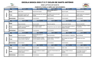 Este documento apresenta a ementa de almoços para o mês de Novembro de 2014 numa escola básica. A ementa inclui a sopa, prato principal e sobremesa servidos em cada dia do mês, variando entre sopas, peixe, carne e alternativas vegetarianas.