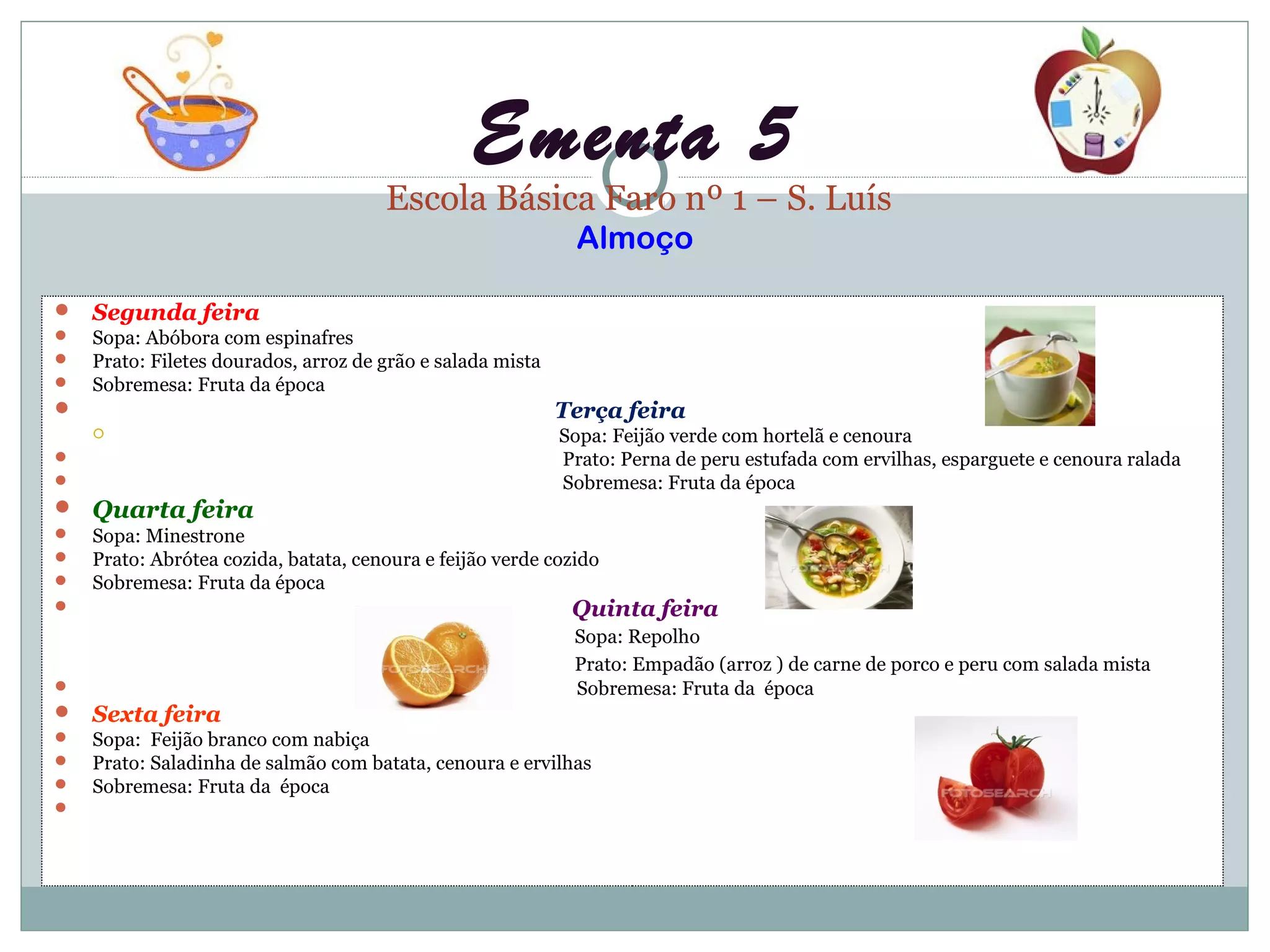 O documento lista o cardápio semanal de almoço de uma escola básica, incluindo sopa, prato principal e sobremesa para cada dia da semana, com opções como abóbora com espinafres, filetes dourados e fruta da época na segunda-feira.