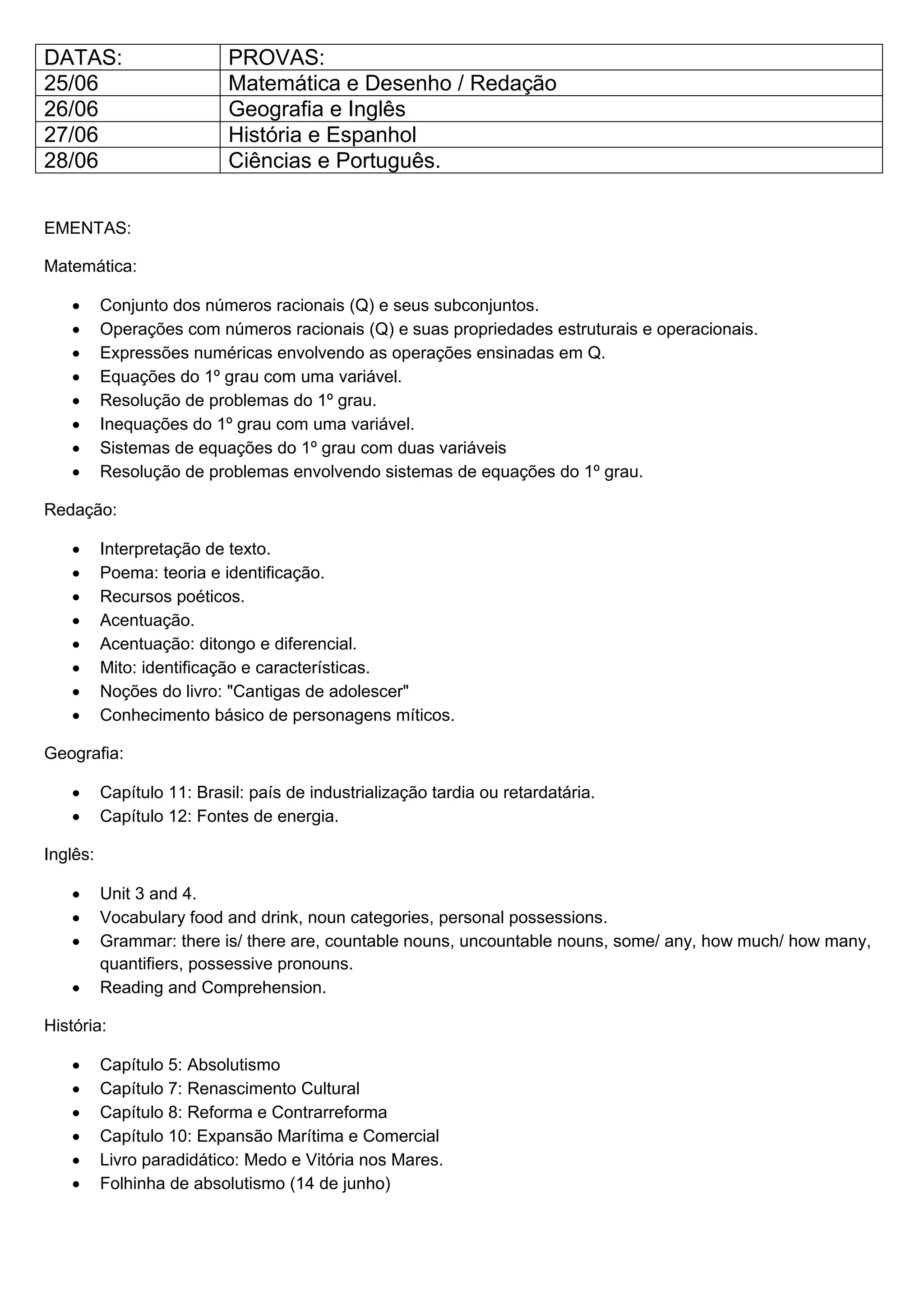 O documento lista os dias e matérias das provas de 25 a 28 de junho, incluindo Matemática, Desenho, Redação, Geografia, Inglês, História, Espanhol, Ciências e Português. Também fornece os tópicos a serem cobrados em cada matéria, como conjuntos numéricos e equações de 1o grau em Matemática, e interpretação de texto e poesia na Redação.