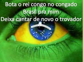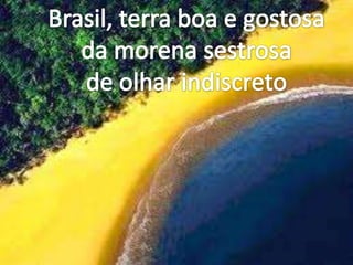 A música celebra o Brasil, descrevendo o samba, o bamboleio e elementos culturais como coqueiros, fontes e a lua. O autor expressa seu amor pelo Brasil e como o considera seu lar.