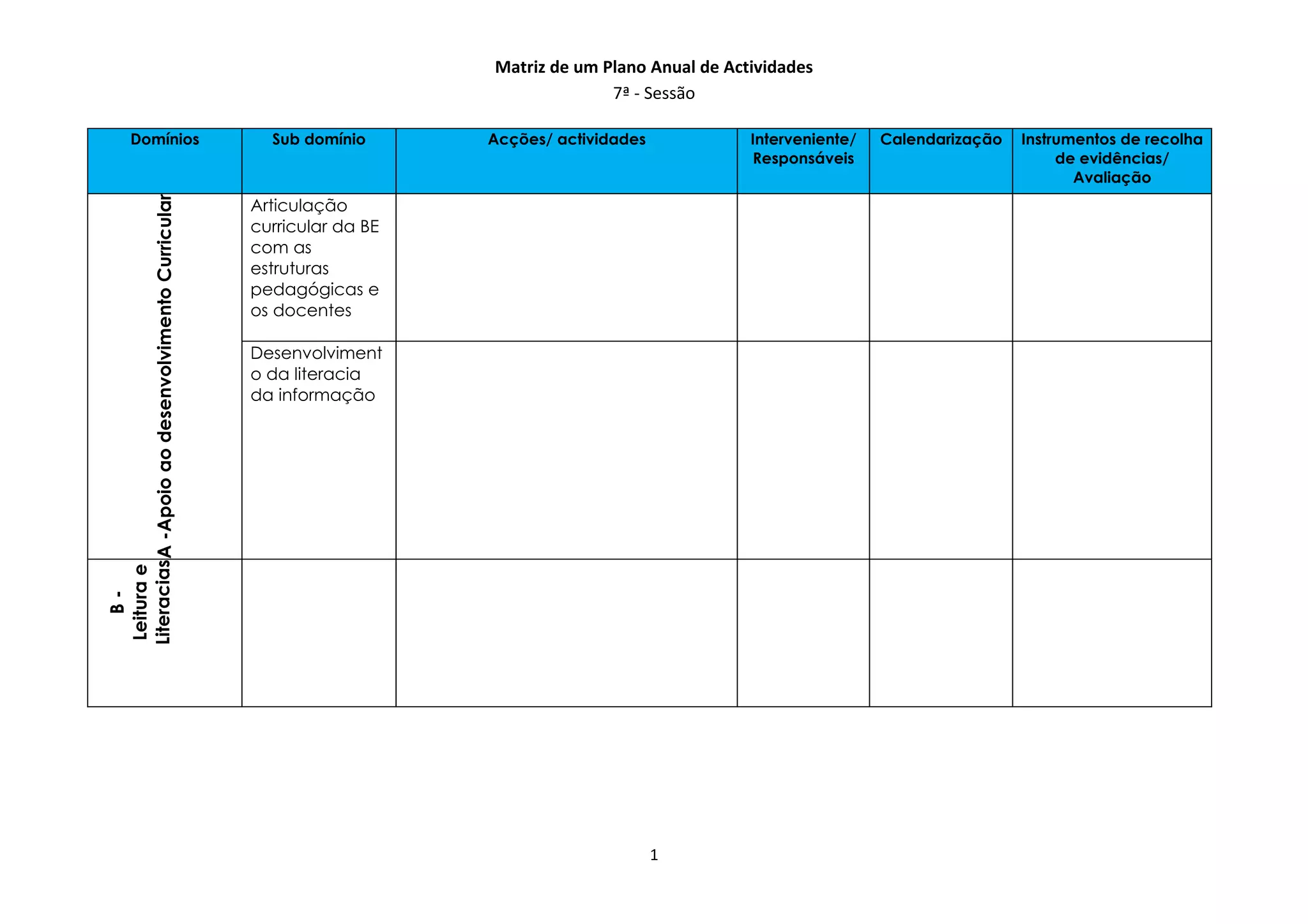A matriz detalha os domínios, subdomínios, atividades e responsáveis para o plano anual de atividades da biblioteca escolar. As atividades incluem apoio curricular, literacia da informação, projetos comunitários e gestão da biblioteca.